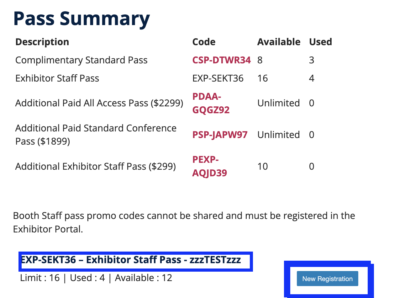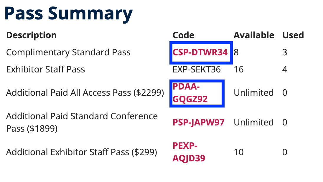 - To register yourself or your team for a Standard Conference or All Access Pass, please click or share the hyperlinked promo code from the Pass Summary in the exhibitor portal, under the button 'Register Your Passes'.